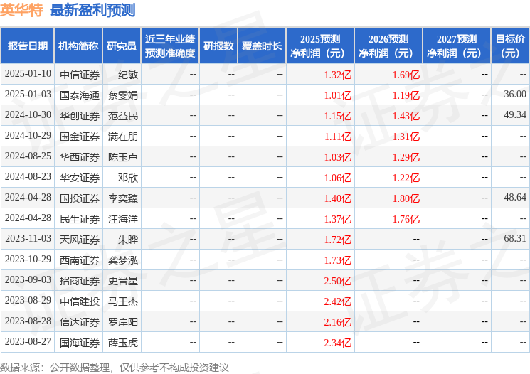 最新盈利预测明细如下: